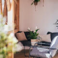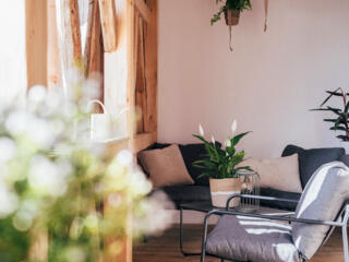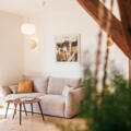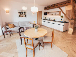 Im oberen Stock des denkmalgeschützen Gebäudes erwartet Euch unsere wohl aussergewöhnlichste Wohnung. Hier wohnt ihr direkt zwischen den über 150 Jahre alten Balken unseres Stadels, die mitten durch die Wohnung gehen.